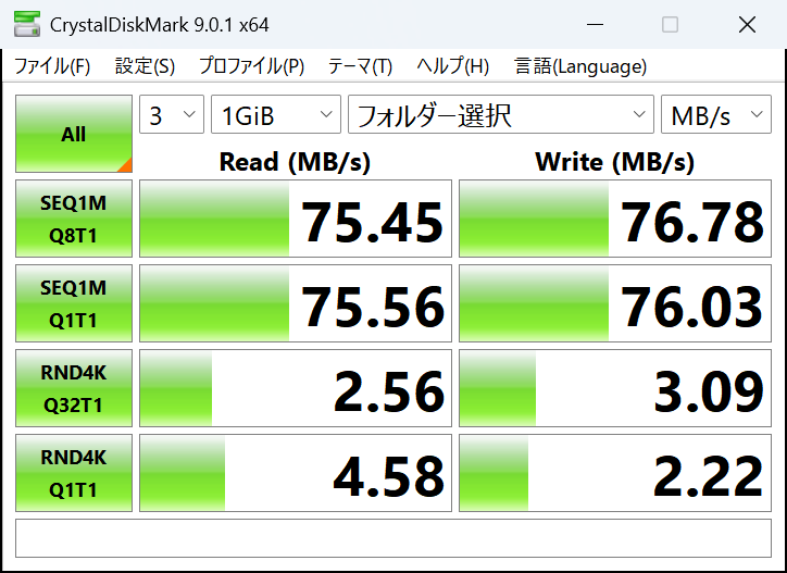 これはPCからNASのPictureフォルダの測定を行ったもの。PC-NAS間は 2.5Gbpsのリンクになっている。ほぼ限界に近いので、PC-NAS間についてはリンク速度がボトルネックになっているのではないだろうか。NASのPictureフォルダはSSDである。