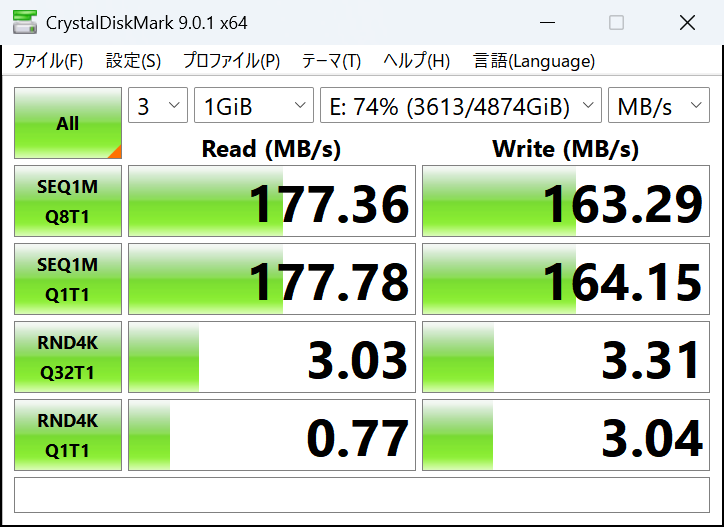 PCのEドライブをデータ用に使うよりは NASのSDDに2.5 Gbpsでアクセスしたほうが速いということ。